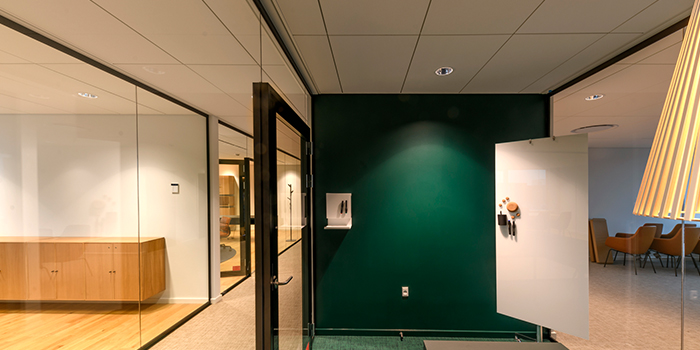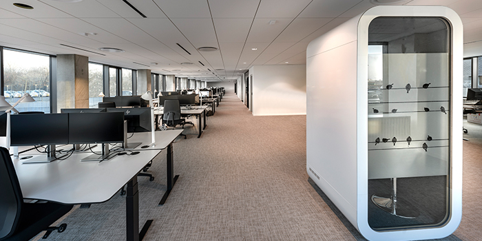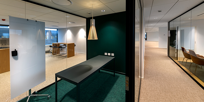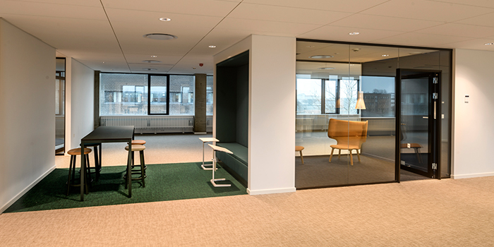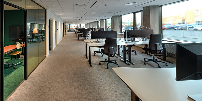 De åbne kontorlandskaber er delt op i zoner, og belysningen er programmeret individuelt til hver enkelt arbejdsplads for at give optimal komfort og det bedste arbejdslys.