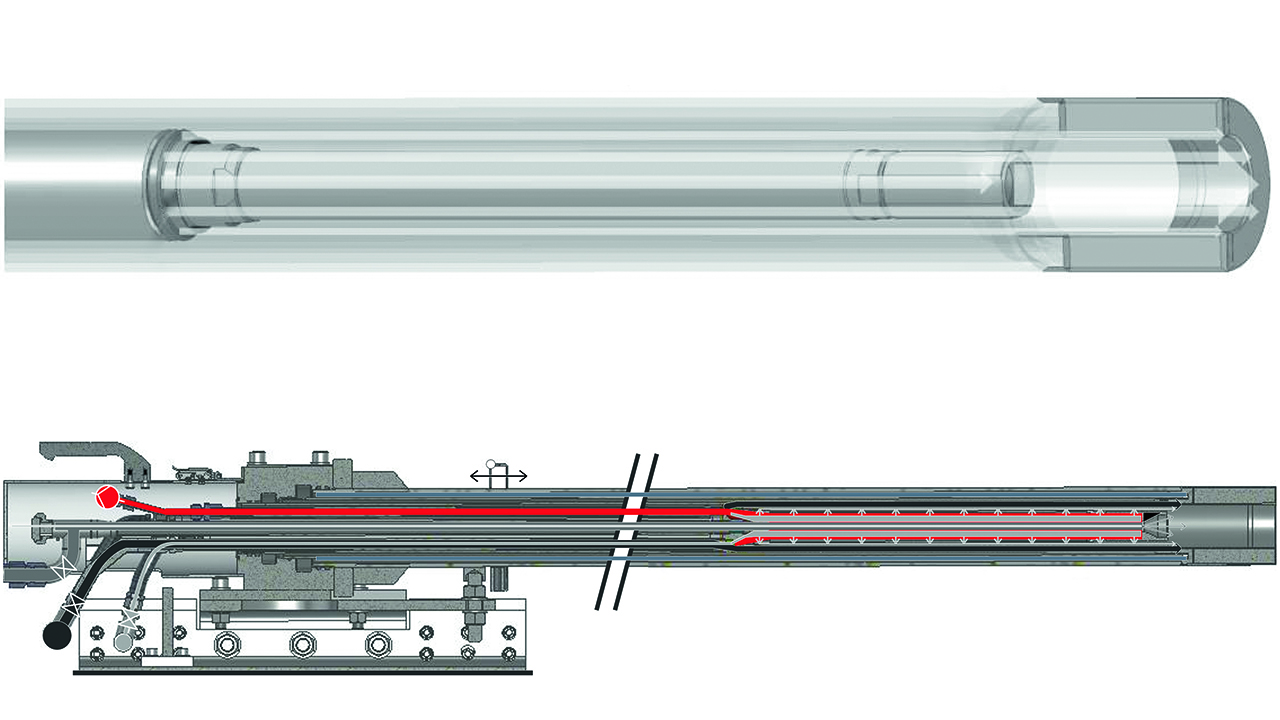 Die Hauptkomponente des ABB ProKiln-Systems ist eine 3 m lange wassergekühlte Sonde mit einem Entnahmefilter an der Spitze. Zwei leistungsstarke Luftkanonen sorgen für den Messgasfluss und die Reinigung. Die Sonde ist auf einem Wagen montiert, der auf einer Fahrvorrichtung läuft.