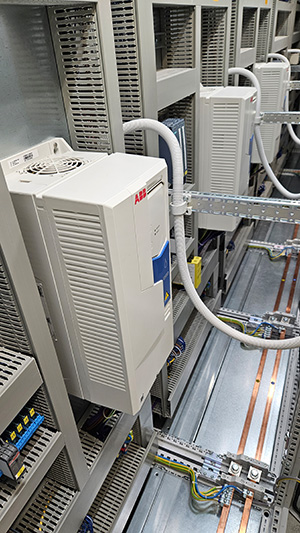 Sieben ABB-Frequenzumrichter ACQ580 regeln in der Anlage die Spülaggregate. (Quelle: Martin Fuhrmann/WEBER-Ingenieure)