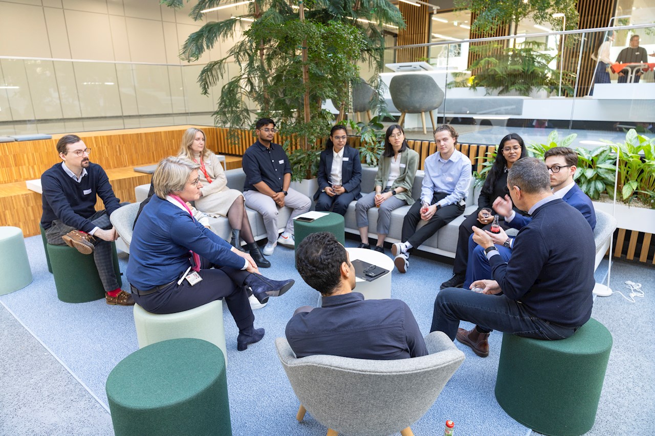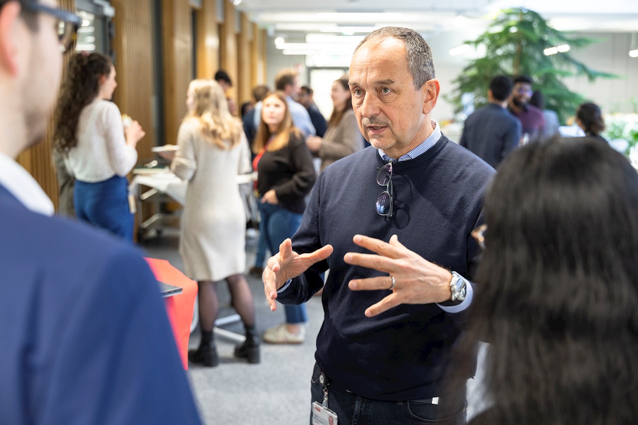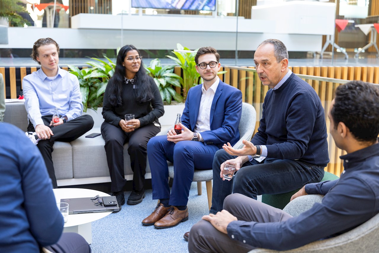 Im Anschluss an die Siegerehrung nahmen sich Führungskräfte Zeit für den direkten Austausch. Besonders inspirierend für die Studierenden war das Gespräch mit Eric Perotti, Vorstandsvorsitzender von ABB AG, der von seinem eigenen Weg berichtete und die Fragen der Studierenden beantwortete: