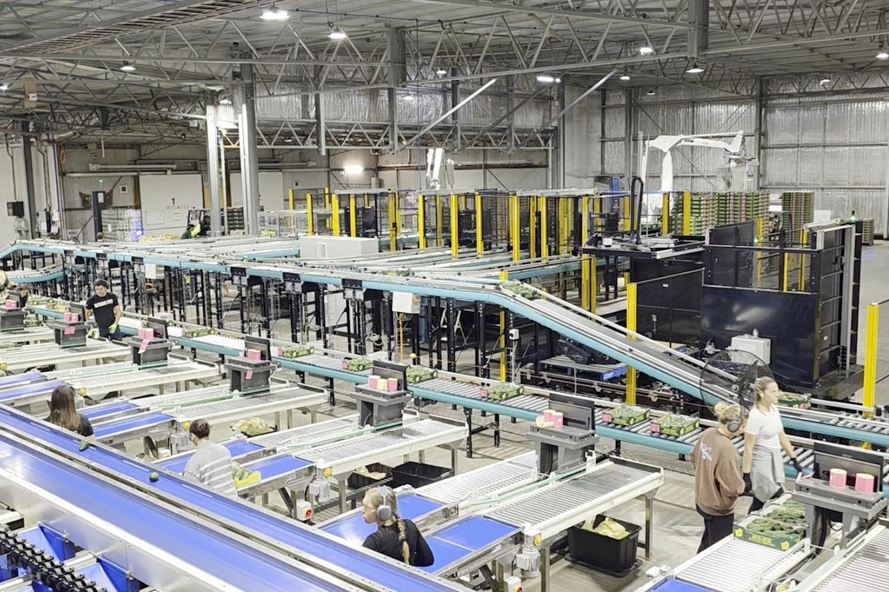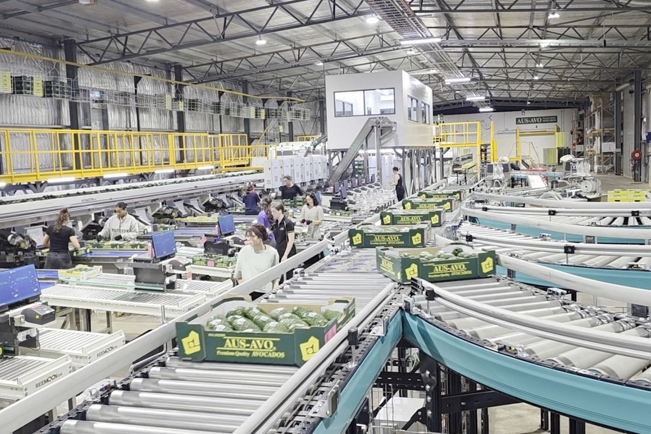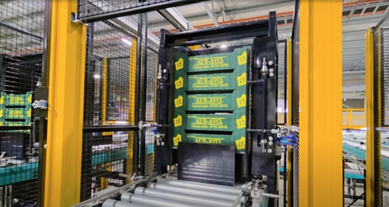 An integrated tray-conveying and robotic fruit-tray palletising system custom-built for Bendotti Avocado by Alnico Systems.