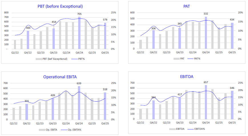 The company reported a Profit before tax (before exceptional items and one-offs) of INR 578 crore, for the quarter and INR 2,230 crore for CY2025. Profitability was affected by higher material costs, forex, QCO related imported material usage, and Labor Code impact, which was partly offset through commodity hedging and efficiency gains.