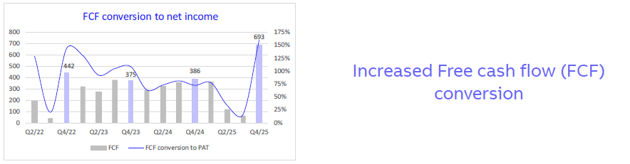 The company’s cash position continues to remain robust at INR 5,694 crore at the end of Q4 and CY2025. The Net Working Capital increase is mainly witnessed in inventories which are consciously built to cater to the delivery of the backlog as per the agreed schedule.