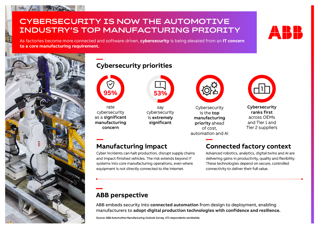 Cybersecurity has become the most significant focus for automotive manufacturers worldwide, according to ABB Robotics’ latest Automotive Manufacturing Outlook Survey, highlighting a fundamental shift in how manufacturers view digital risk, operational continuity and the future of vehicle production.