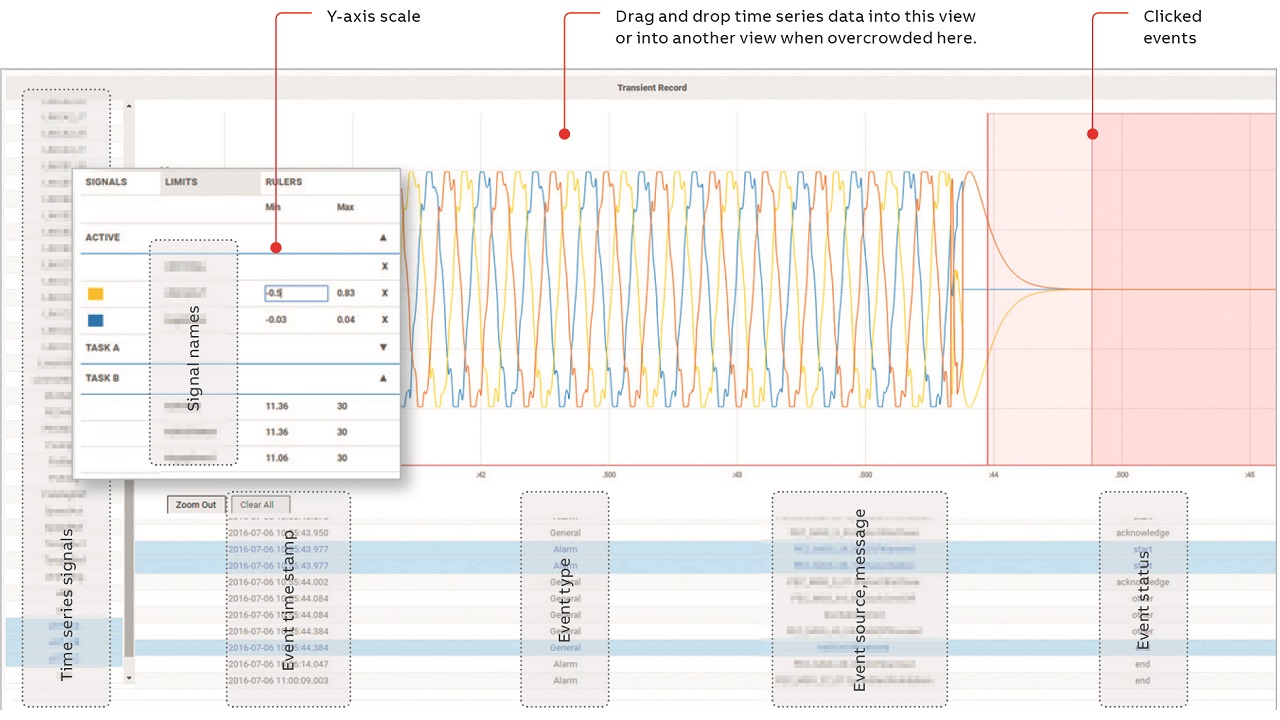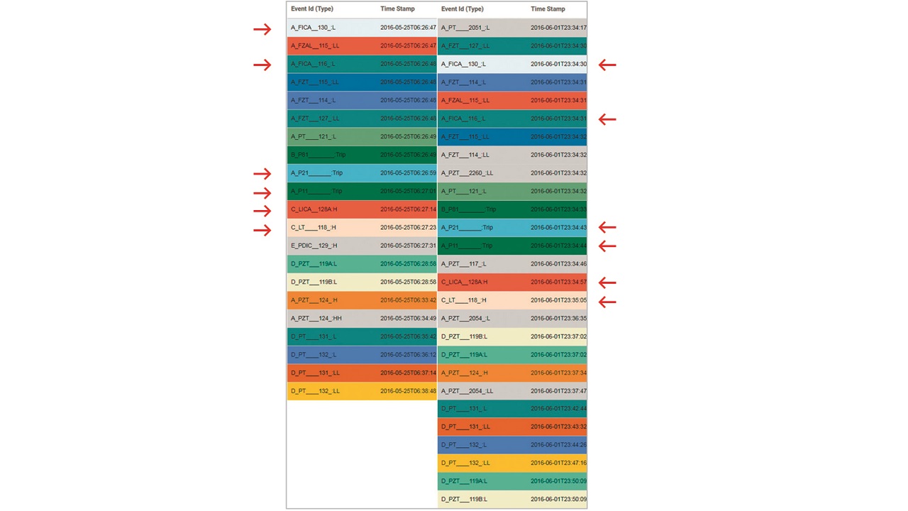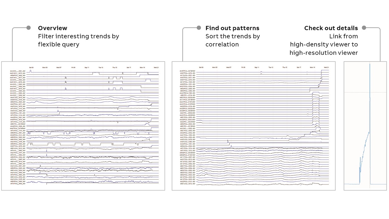 Relying on their experience, ABB service engineers began by investigating process alarms and trip events. The DIAS Alarm and Event Data Explorer (AE Explorer) was shown to help the engineers to quickly identify interesting events. The results can be presented in comprehensive, yet human-readable views →3. By diving into details, dragging, and many other actions, engineers can easily explore the data to gain clarity about the event or situation in question.