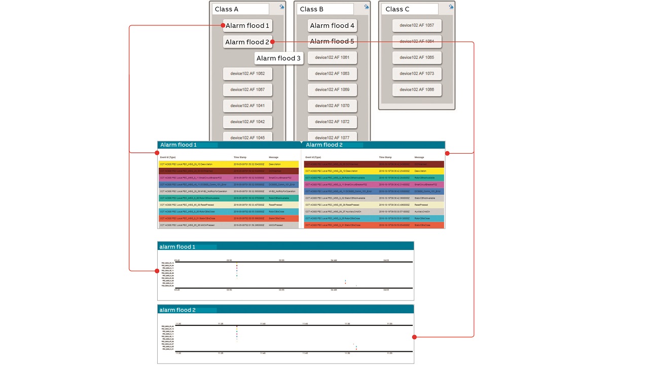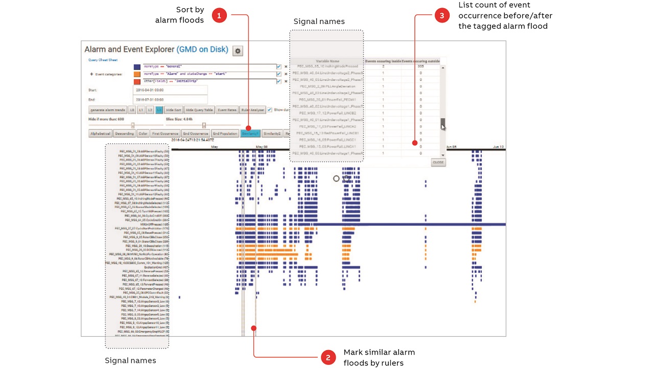 The higher the frequency of an event, the greater is the possibility that this event has a cause common to that of the tagged alarm floods →6c. This ability to classify events and root out alarm flood causes contributes to safety, productivity and hence profitability.