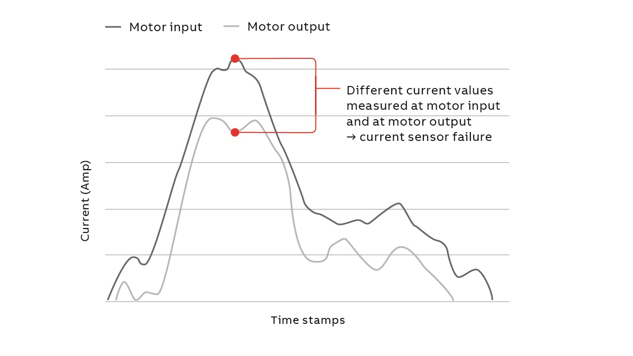 The transient recorder viewer allows service engineers to gain deep insights into the history of an event. For instance, they can identify a sensor failure by comparing the difference between current values measured for motor input and motor output →7b.