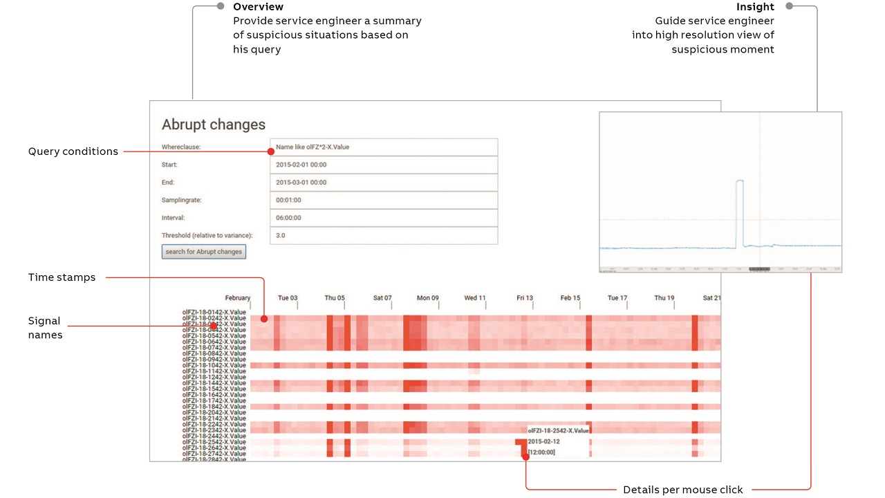 In addition to providing an overview of specific interesting situations across signals, DIAS provides heat map views that highlight important features in time series data, eg, a heat map that shows abrupt changes in signals →8a. Each observed heat map episode represents the abrupt change level of a signal at a specific moment. The darker the color, the greater is the change level. When engineers click on one episode, they are redirected to a high-resolution trend viewer for more detailed inspections. Another helpful tool is the DIAS high density trend viewer, which can provide engineers with an overview of the queried time series data →8b. To help engineers understand time variation patterns better, the trend viewer ranks signals based on trend shape similarity; the most similar shapes are ranked highest and listed at the top. All of these aforementioned tools provide the necessary capabilities that make DIAS an invaluable analytical system for process industries that rely on gearless mill drives.