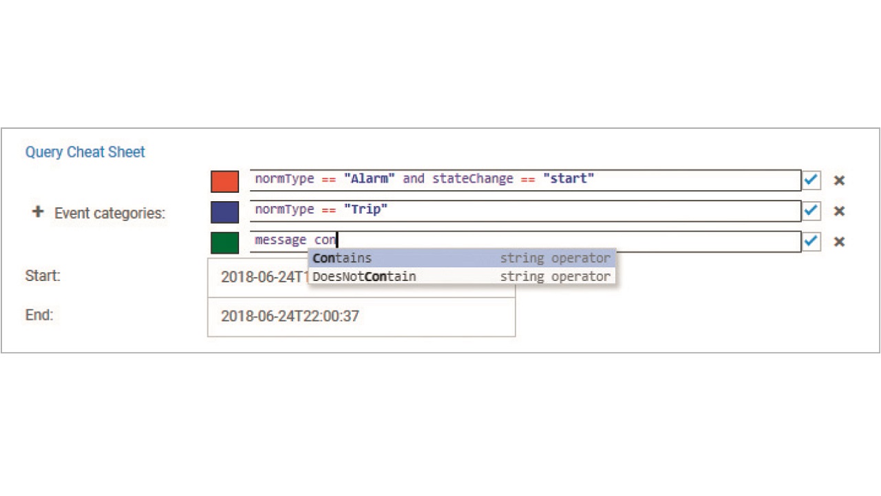 Due to the wide diversity of alarm management systems used currently by process industries, there are various popular alarm and event data storage paradigms. To shift the complexity of data connection away from the service engineer’s work, DIAS offers configurable data connections. Additionally, different data connections can be switched seamlessly via the user interface, such as ABB Real Time Database (RTDB) file system, Microsoft SQL Server, Oracle database and Elastic search. Regardless of which data storage is connected, the service engineer can search for interesting alarms and events with a universal query interface →3b. Such queries embed a wealth of process knowledge. To share that knowledge and save query efforts, DIAS stores query templates and makes them accessible to different users. Thus, a comprehensive user-friendly and flexible system is available to serve customers.