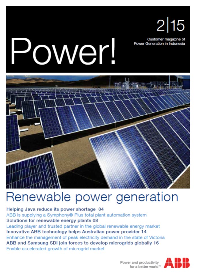| Issue: 2/2015 (Please click here to downlaod) Highlights: - Helping Java reduce its power shortage - Solutions for renewable energy plants - Innovative ABB technology helps Australian power provider to match peaks and troughs in electricity demand - ABB and Samsung SDI join forces to develop microgrids globally - ABB and Vestas initiative to supply remote areas with wind power |