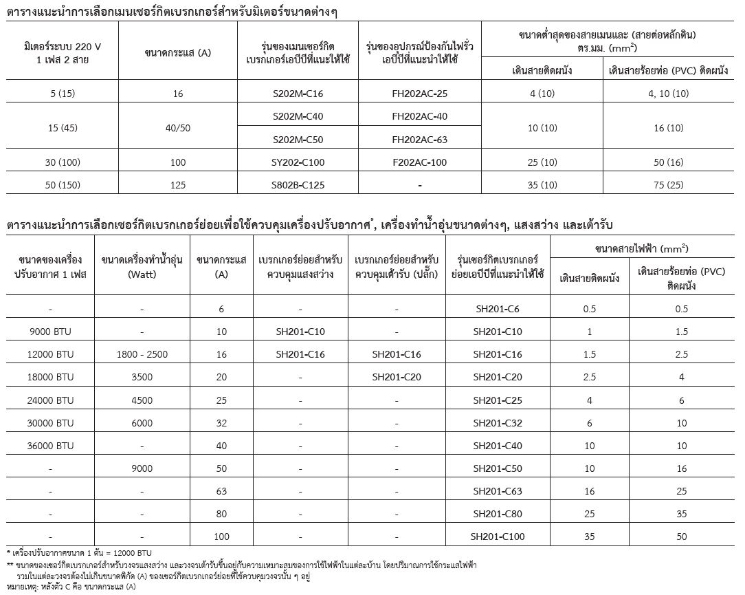 ส่วนการเลือกขนาดที่เหมาะสมของเซอร์กิตเบรกเกอร์เมน ให้เลือกใช้สอดคล้องตามขนาดของมิเตอร์ไฟฟ้า และเลือกเซอร์กิตเบรกเกอร์ย่อยตามขนาดของสายไฟและอุปกรณ์ไฟฟ้าที่จะใช้งานในแต่ละวงจรตามตารางต่อไปนี้ เพื่อให้การป้องกันอันตรายจากไฟฟ้าเป็นไปอย่างมีประสิทธิภาพสูงสุด