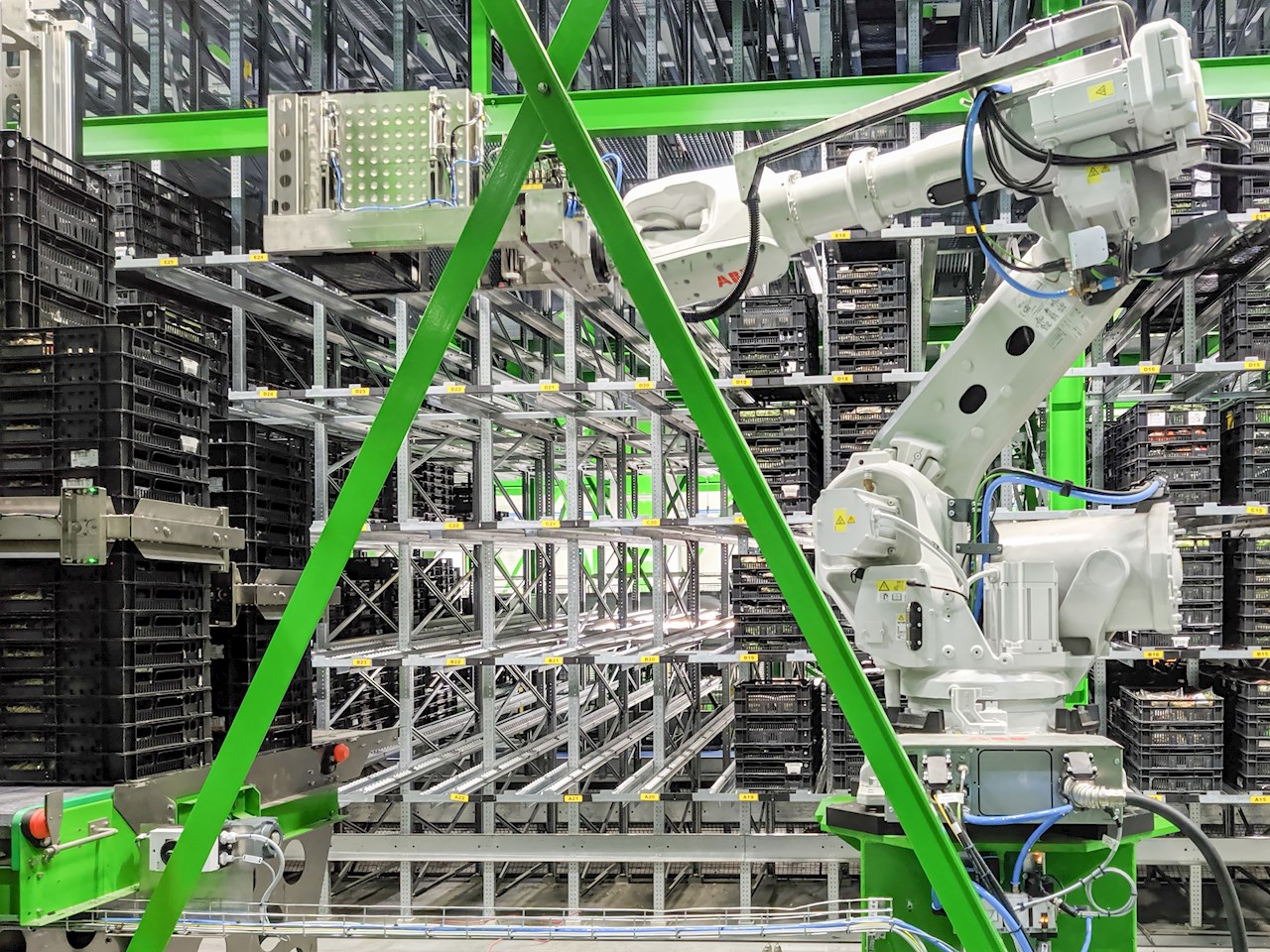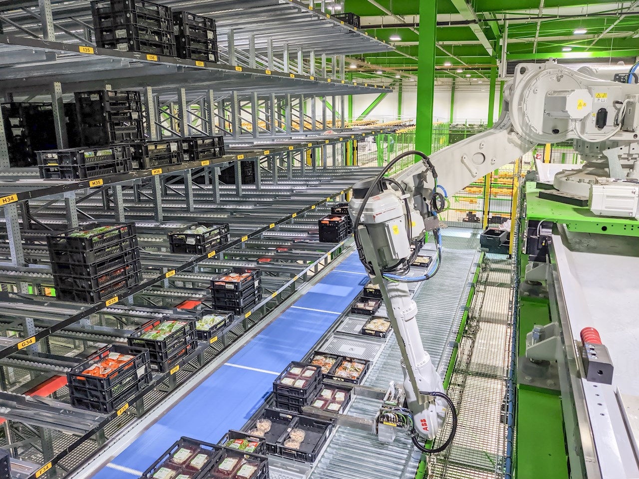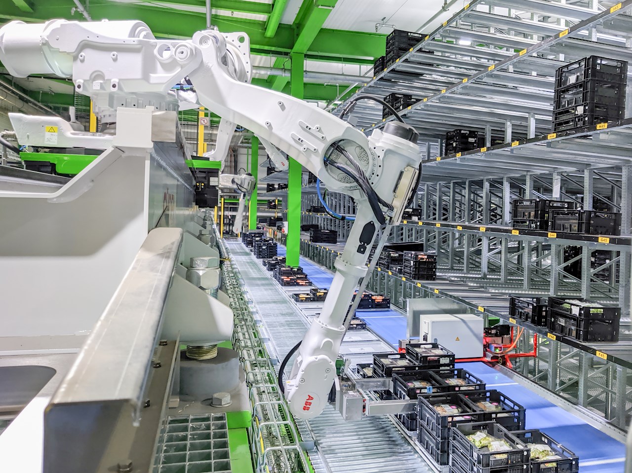 - Un robot IRB 660 en début de flux tire les caisses contenant les commandes d’un supermarché et les placent sur un tapis roulant en direction de la zone de préparation des commandes.