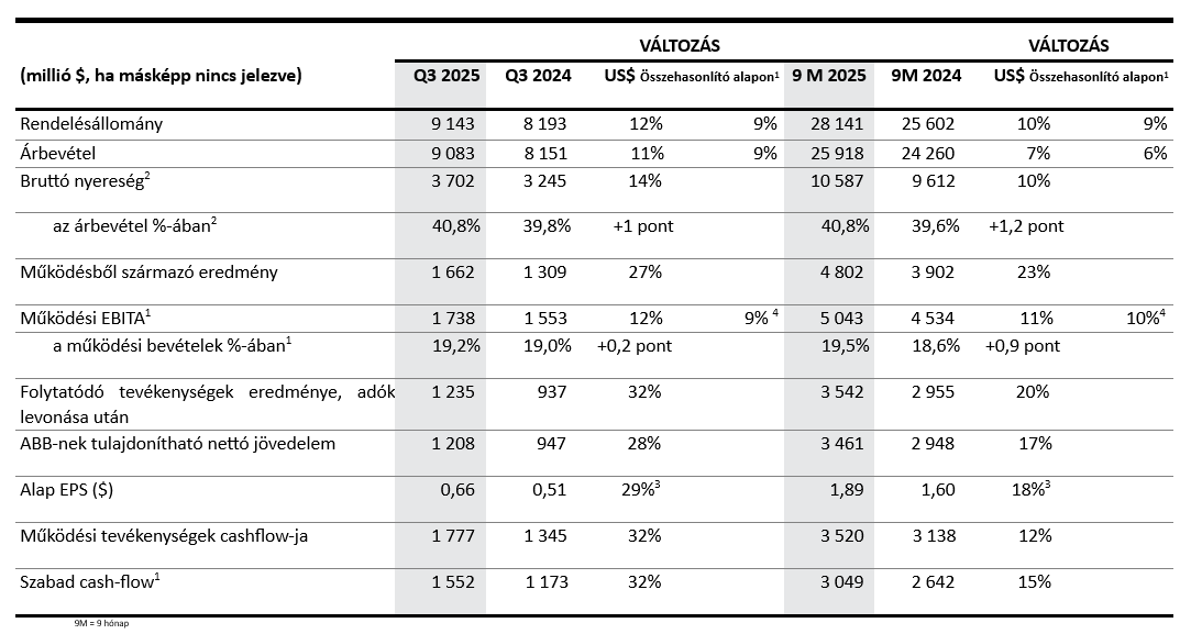 2025 harmadik negyedévében örömmel tapasztaltam, hogy az általános piaci helyzet stabil, mivel az ügyfelek továbbra is beruháznak az elektromos energia és az automatizálás területén. Pozitív, 1,01-es book-to-bill arányt értünk el, amelyet négy üzletágunkból három támogatott, míg a Robotika és Gyártásautomatizálás üzletágunk teljesítményét továbbra is visszafogta a kihívásokkal küzdő automatizálási piac. A működési eredményeink kissé még az eredeti várakozásainkat is felülmúlták: a negyedéves számaink 11%-os (összehasonlítható alapon 9%-os), erős bevétel-növekedést, 20 bázispontos, 19,2%-ra javuló árrést és 1,6 milliárd dolláros erős szabad cash flow-t mutatnak. Mindent egybevetve, jó úton haladunk afelé, hogy az ABB újabb rekordévet zárjon.