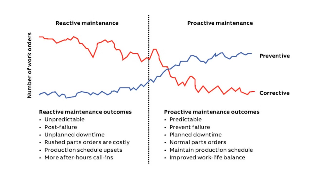 2 – Pereinant nuo reagavimo prie prevencinės priežiūros, ženkliai sumažėja poreikis korekciniams veiksmams. X ašis žymi sąlyginį laiko grafiką [2]