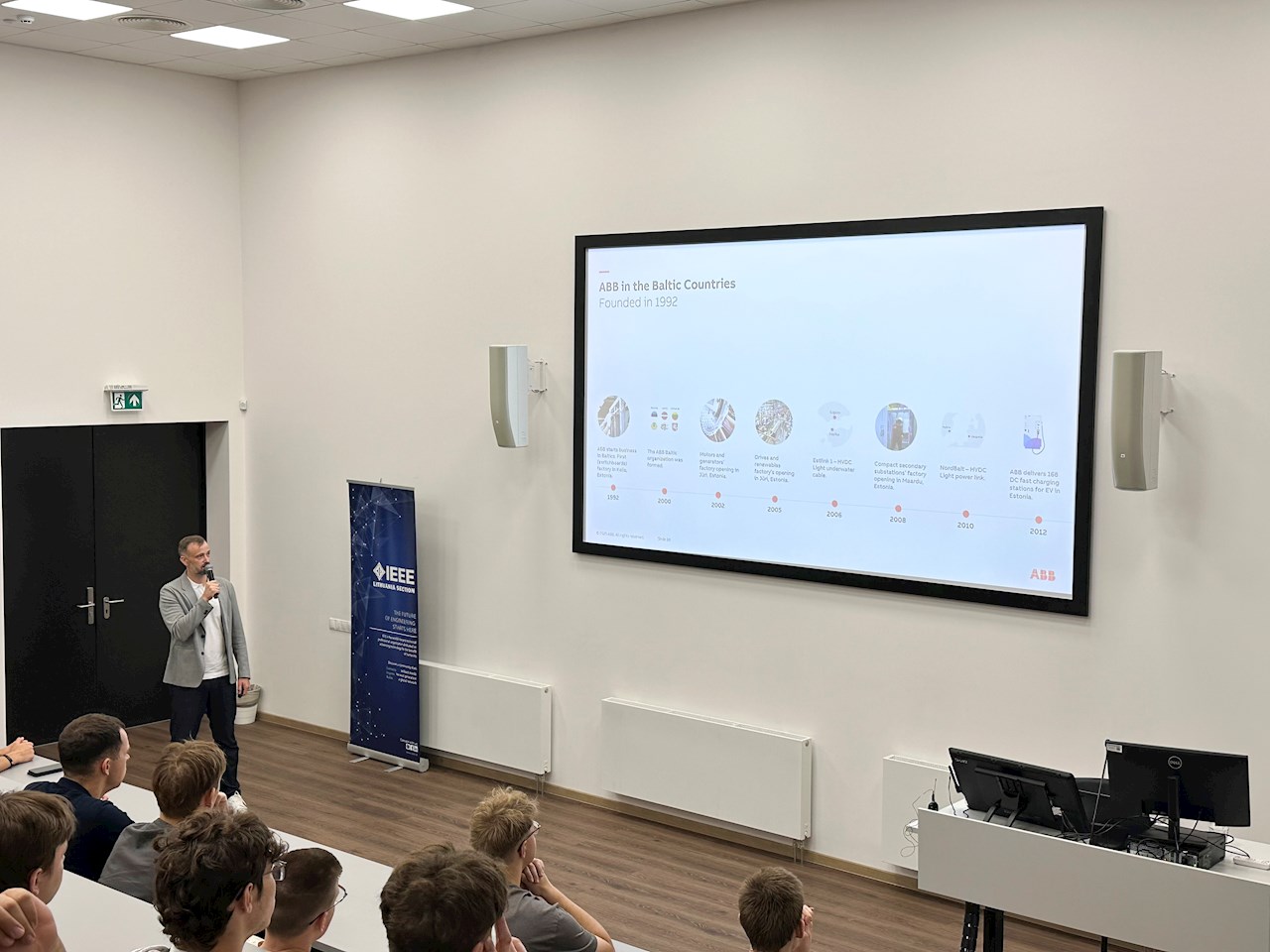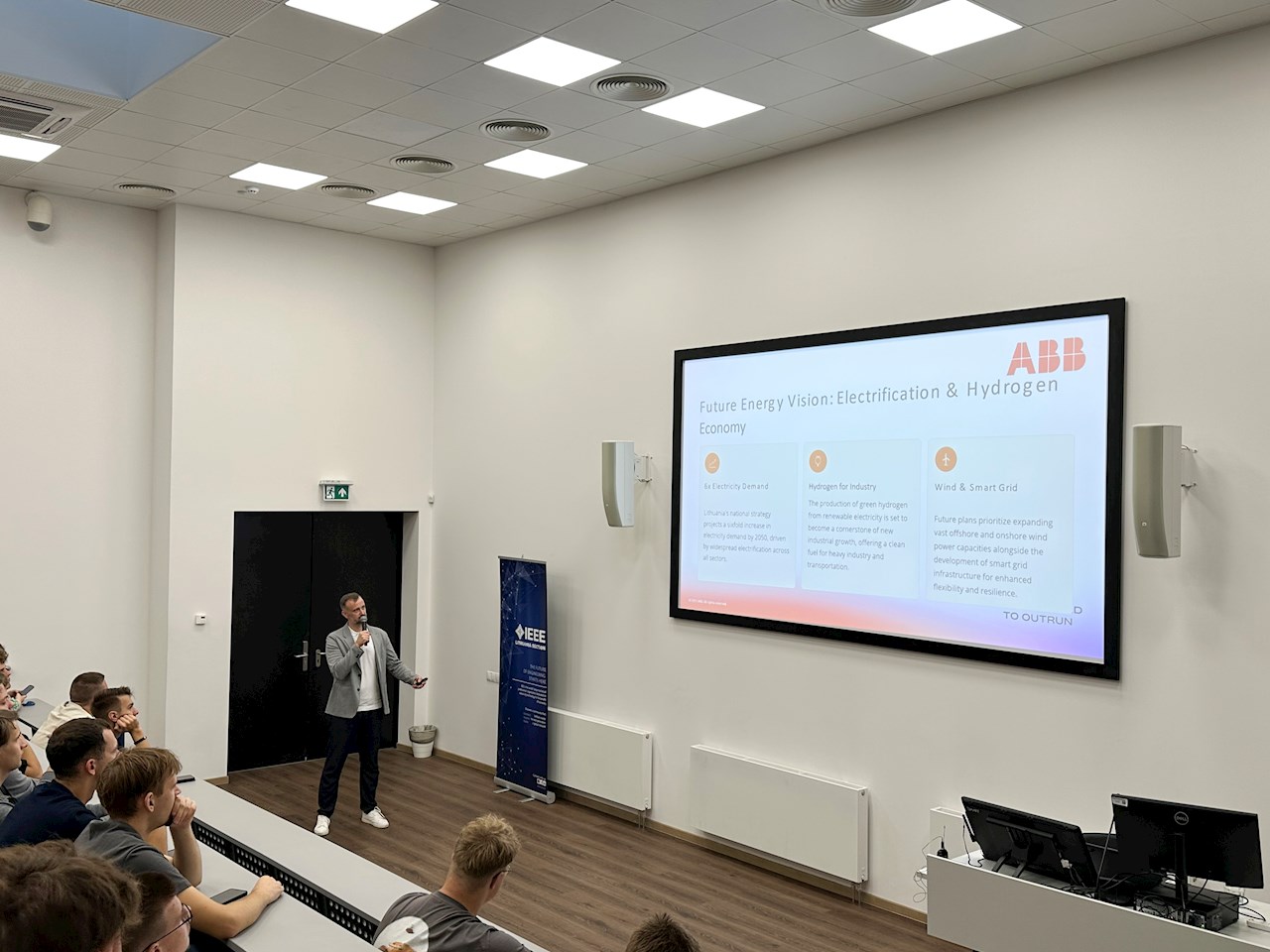 Rugsėjo 3 d. VILNIUS TECH Elektronikos fakulteto pirmo kurso studentai turėjo progą susitikti su ABB elektros variklių ir pavarų verslo Lietuvoje vadovu Justinu Pesliaku ir išgirsti apie jo profesinę patirtį, susipažinti su ABB organizacijos struktūra Baltijos šalyse ir veiklos sritimis.