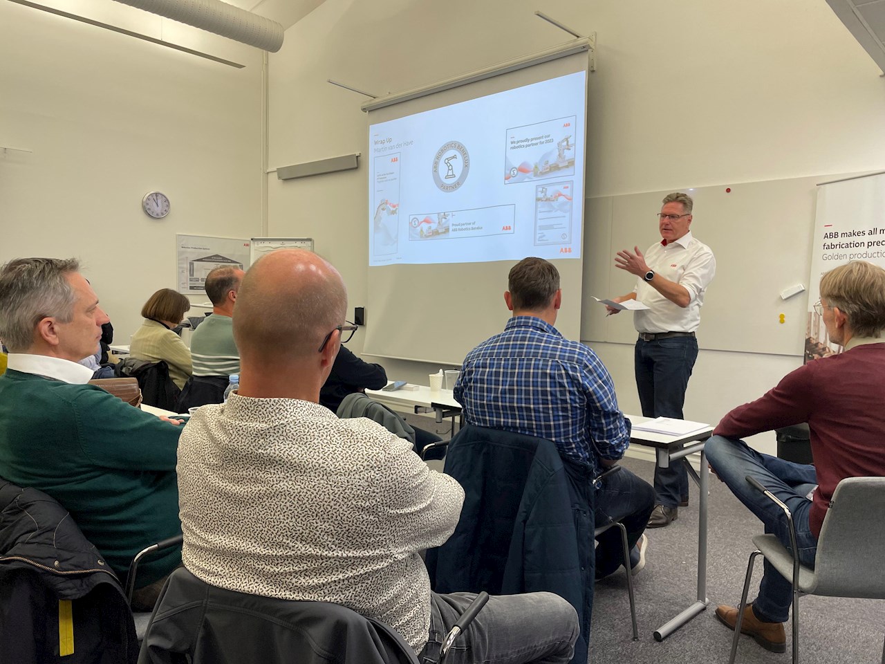 Woensdagochtend 25 oktober vertrokken circa 50 partners en ABB-collega’s in drie vliegtuigen vanuit Amsterdam en Brussel naar Zweden. Op de eerste dag stonden presentaties van diverse Global Product Managers centraal. Zij lichtten de relaties in over de laatste trends en ontwikkelingen binnen robotica en ABB. Uiteraard was hierbij veel ruimte om vragen te stellen over RobotStudio, OmniCore-controllers en allerlei robots, applicaties en toekomstverwachtingen bij ABB. De dag werd afgesloten met een netwerkdiner.