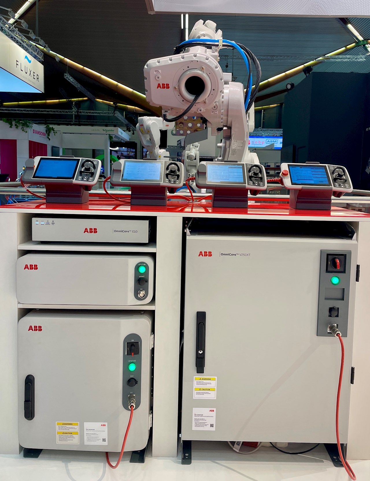 - Aquarium : vier verschillende robots waren voor de veiligheid van de aanwezigen in een ‘aquarium’ geplaatst. Hiernaast stond een kastje met vier verschillende OmniCore-controllers erin en vier FlexPendants erop voor de bediening ervan.
