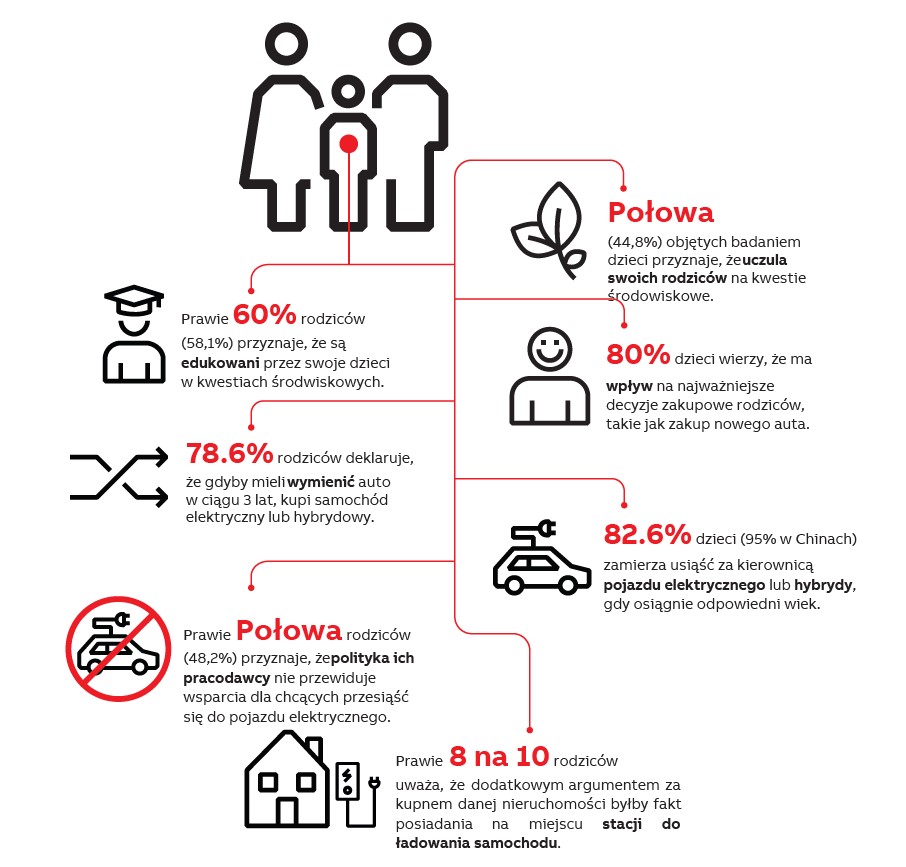 Prawie połowa dzieci uczulała swoich rodziców, aby ci w większym stopniu dbali o środowisko. Z drugiej strony 58 proc. rodziców przyznało, że dzieci edukują ich w obszarze ekologii. 80 proc. dzieci wierzy, że ma wpływ na najważniejsze decyzje zakupowe rodziców. Nie zaskakuje więc fakt, że prawie taki sam odsetek rodziców deklaruje, że gdyby mieli wymienić auto w ciągu najbliższych 3 lat, kupi samochód elektryczny (EV) lub hybrydowy (PHEV).