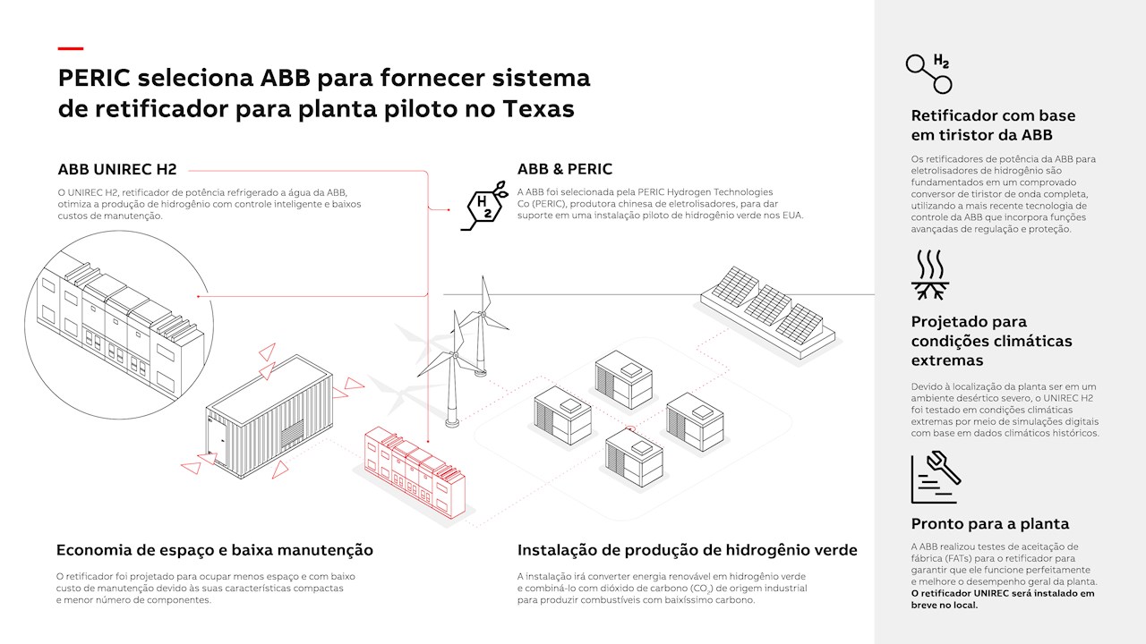 Quando falamos de fontes alternativas de energia, o hidrogênio assume um papel crucial como condutor de energia limpa e renovável. A ABB, com seu portfólio de soluções digitais e de automação, continua fornecendo suporte à indústria do hidrogênio em escala global e prova disso é a parceria estabelecida com a PERIC Hydrogen Technologies Co (PERIC), renomada produtora de eletrolisadores que selecionou a ABB para apoiar a implementação de uma instalação piloto de hidrogênio verde no deserto do Texas, nos EUA.