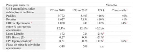 A variação em dólar e taxas de câmbio versus o período do ano anterior resultaram em um impacto positivo de conversão de 7% nos pedidos relacionados. As alterações no portfólio de negócios, relacionadas com a aquisição da B&R, compensadas por desinvestimentos feitos em 2017, tiveram um impacto líquido positivo de 3% no total de pedidos relatados. A relação book-to-bill foi de 1,13x, em comparação com 1,07x no primeiro trimestre de 2017.