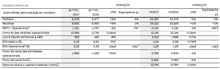 ABB executou sua estratégia Next Level ao longo de 2017. A empresa lançou o ABB AbilityTM, sua plataforma de soluções digitas, e continuou investindo em digital, vendas, na imagem da marca, e pesquisa e desenvolvimento. Apresentou forte economia em White Collar Productivity e na excelência operacional/cadeia de abastecimento, e concluiu ou anunciou uma série de transações importantes. Continuou a eliminar o risco de seu portfólio, alienando as empresas fora do âmbito de sua atividade central, e tomando medidas para implementar sua mudança no modelo de negócio EPC (Engenharia, Suprimentos e Construção). Essas atividades impactaram os resultados do ano todo. O EBITA operacional da empresa diminuiu 2% (1% em dólares americanos) para $ 4,130 bilhões, incluídos aproximadamente $ 140 milhões de encargos relacionados com as empresas EPC. A margem EBITA operacional foi de 12,1%, 30 pontos base inferior devido a encargos relacionados com as empresas EPC e teria ficado estável sem estes encargos.