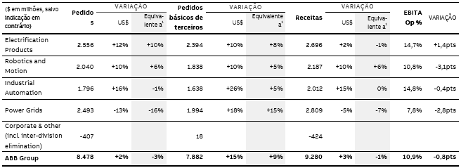 O total de pedidos foi 10% mais elevado (12% em dólares americanos), uma vez que todas as regiões e mercados finais mostraram forte demanda em especial para data centers, alimentos e bebidas, e soluções de carregamento rápido de veículos elétricos. Os pedidos de base de terceiros aumentaram 8% (10% em dólares americanos). A receita diminuiu 1% (2% superior em dólares americanos), conforme os aumentos na receita de ciclo curto não foram suficientes para compensar a receitas inferiores do sistema. A margem do EBITA operacional de 14,7% foi auxiliada pela redução de custos e melhoria dos preços, apesar dos ventos contrários, em curso, dos preços das commodities.