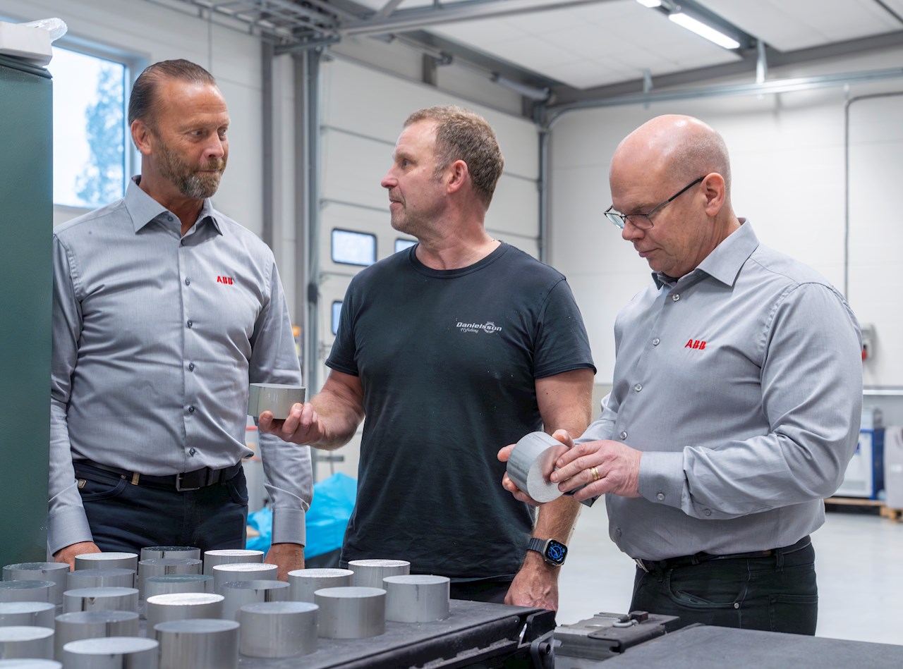 "Jag ser inte ABB som en leverantör utan som en partner, vilket är otroligt värdefullt", säger Tomas Danielsson. På bilden: Peter Mokricki, ABB, Tomas Danielsson, Danielsson Flyreels och Patrik Wik, ABB.