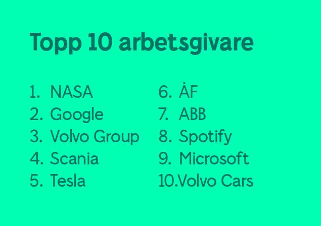 Undersökningen visade att den aspekt som var viktigast för teknikstuderande var att företaget erbjöd intressanta och utmanande arbetsuppgifter. Dessutom framgick det tydligt att hållbarhetsfrågan är högt prioriterad där 45 % ansåg att det är viktigt att företaget jobbar aktivt för ett bättre klimat.