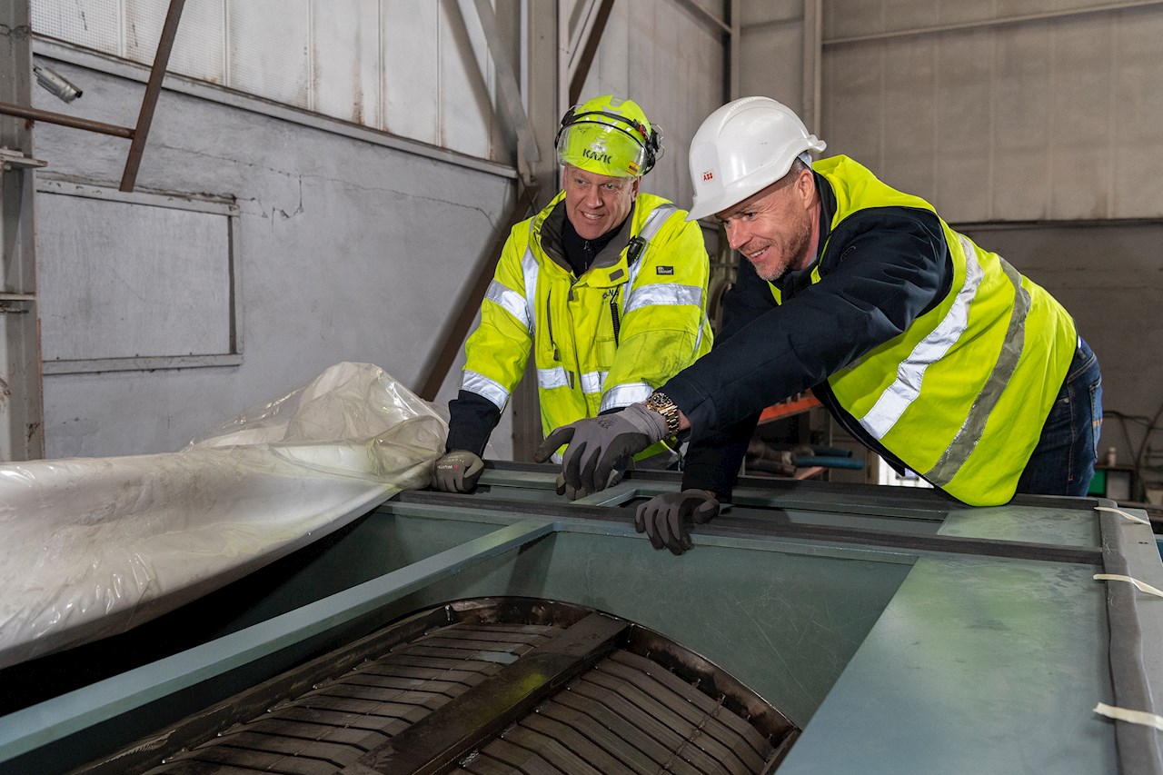 - Känner du värmen när vi skär ett hål i plasten? Vi har en liten värmare som står längst ner i lådan för att skydda den från fukt, säger Jan Hoveling till ABB: s försäljningsingenjör Christian Vestergaard, som hjälper till att hålla hjulen - och inte minst motorerna - igång vid Stena Recycling. Christian Vestergaard nickar innan han och Jan Hoveling fördjupar sig i detaljerna för den enorma elmotorn.