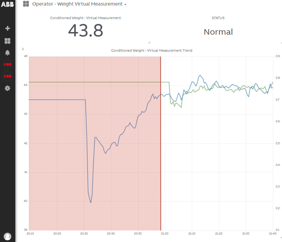 Genom att förse operatörerna med en kontinuerligt optimerad modell eller ”soft sensor” hjälper Weight Virtual Measurement till att reducera stilleståndstiden, förbättra kvalitetsbyten och uppnå kvalitet inom specifikation på kortare tid. Operatörsskärmar kombinerar olika data och markerar när den virtuella mätningen är tillgänglig och QCS-mätningen är frånvarande. Operatörer kan då se aktuell status och arbeta med ett urval av justeringar för att komma tillbaka till målvärdet.