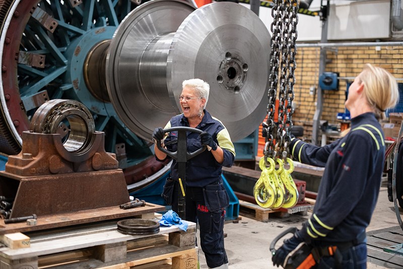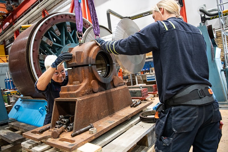 Marika Haarahiltunen och Ankie Nyman Stridh arbetar med helrenovering av en DC-rotor på ABB i Storvik