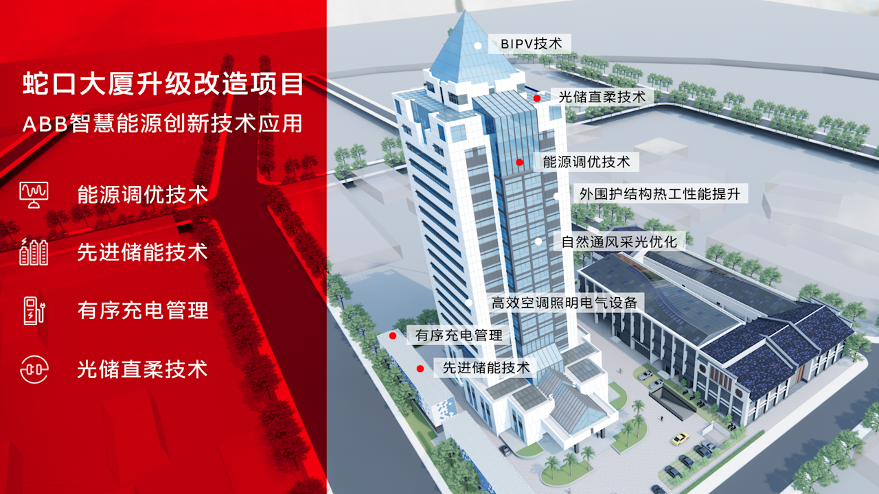 在现有建筑的升级上,ABB同样稳步推进——应用ABB智慧能源创新技术的深圳蛇口大厦改造成为近零碳排放建筑试点示范项目,项目中应用了ABB ZEE600智慧能源管理系统、eStorage智慧储能小屋及EVinn TA充电桩,通过源荷储的精准调控实现光伏消纳及负荷的优化调控节能减碳。