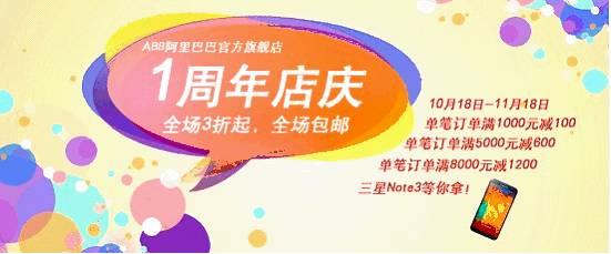 ABB阿里巴巴官方旗舰店(http://cnabblp.cn.1688.com)于2012年10月入驻阿里巴巴工业品品牌商城,现已上架低压全系列产品及中压部分产品;并与阿里巴巴联合举办新品发布会、品牌汇等多场大型营销活动,成果喜人!为回馈客户,特于2013年10月18日-11月18日举办1周年店庆酬宾活动,全场3折起,更有年度大奖三星Note3手机等你拿!ABB经销商招募活动即将开启,详情敬请期待!