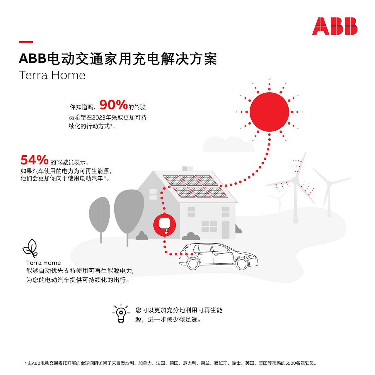 为庆祝该款全新家用充电解决方案的发布,ABB电动交通面向世界多个国家的驾驶员们开展了一项调研,咨询了他们在2023年交通出行方面所关注的重点,结果显示加强交通的可持续化发展是他们最关注的领域之一。有90%的受访者认为自己有义务采取更加可持续化的行动方式来保护地球,保护下一代。