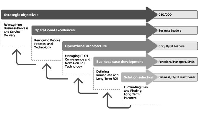 Digital transformation needs a CEO vision for how these next-generation technologies will impact strategy. It needs to build on existing operational excellence initiatives to ensure people, process and technology capabilities are aligned; it needs technologies to ensure there is an architecture in place to bring together both IT and OT; and it needs business leaders to build local business cases and select the right technology solutions that meet the needs.